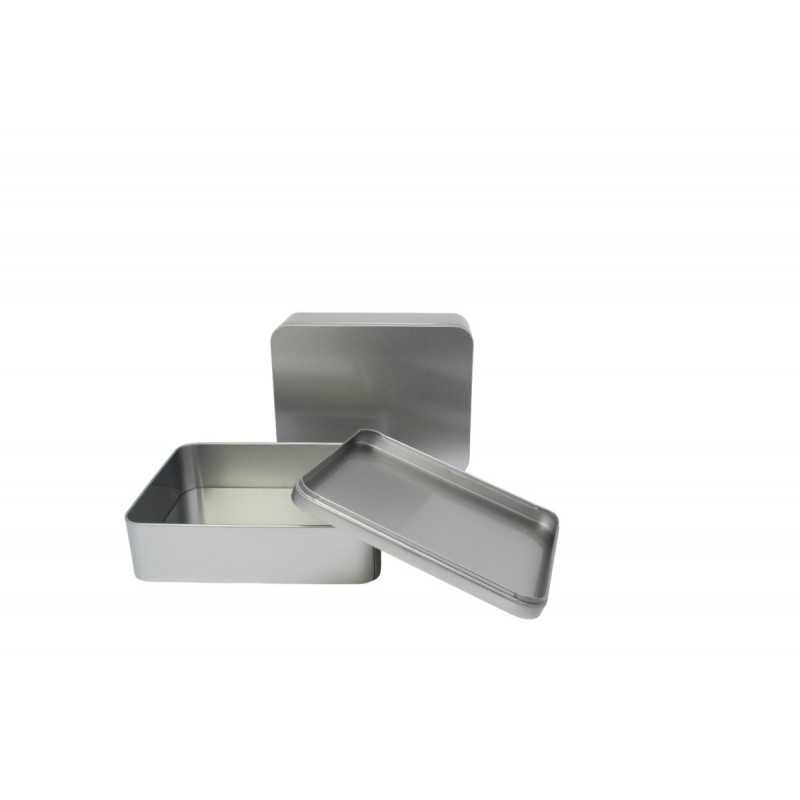 Rectangular metal box with food-safe interior varnish.